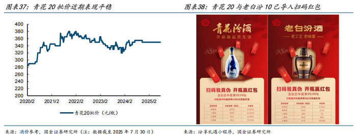 近两年公司持续提升腰部、尤其老白汾系列重视度。1)2024年青花20与老白汾10焕新上市,成为公司推进五码合一、数字化运营的核心单品。2025年春节后老版产品停货,渠道陆续导入新版扫码装产品。2)2024年公司提出4个百亿大单品规划,即玻汾、老白汾、青花20、青花26/30,老白汾作为其中一极、重视度可见一斑。