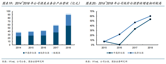 2014~2018年,以玻汾为主的低价白酒营收由10.6亿元增长至32.3亿元,期内CAGR达32.2%,占白酒业务比重由28.9%提升至36.0%。玻汾自省内向省外推广,首先解决了消费端对汾酒产品“买得到、喝得着”的问题,有了氛围基本盘和口碑效应后,为品牌认知和青花系列客群的培育奠定基础。