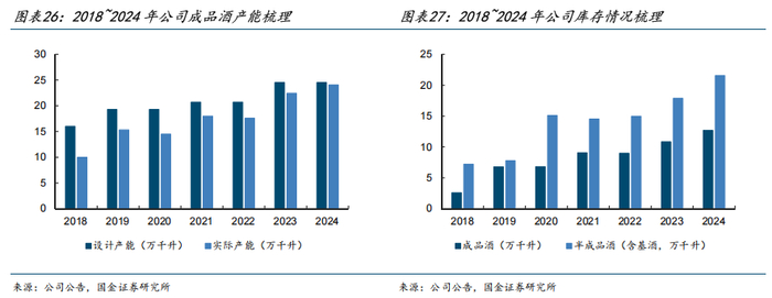 除此之外,公司目前在建产能还包括:白玉酒厂改扩建项目(规划投资约5亿元,估算可新增原酒产能约1万吨,2024年末在建工程余额约580万元、进度较慢)、汾青2万吨原酒基地项目(规划投资约14.8亿元,预计新增原酒产能2万吨、储能2万余吨,于2024年末动工)。