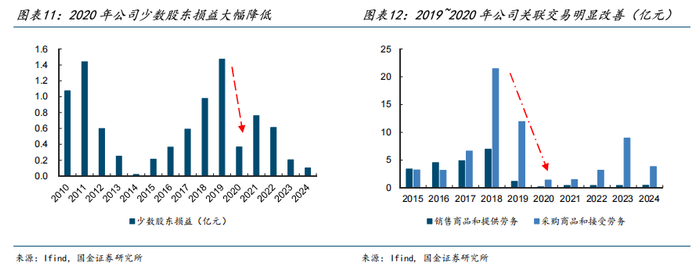 2020年,公司进一步收购集团所持酒业发展区51%股权,股份公司与集团间关联交易显著下降,少数股东损益明显收窄。目前,公司少数股东损益主要来自非全资子公司发展区股份(中汾酒业持股49%),采购相关的关联交易主要系向联营公司万易达包装采购包装材料。