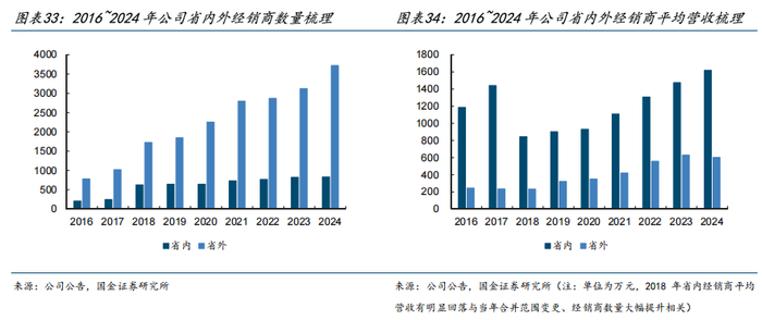 2018~2024年,公司省内、省外经销商分别由628、1726家增长至835、3718家,单经销商年均营收由842、233万元提升至1617、602万元。拓商的同时公司也积极扶商,2024年亿元级大商增至51家,5000万~1亿元级经销商增至76家,构建公司稳健的经营底盘。