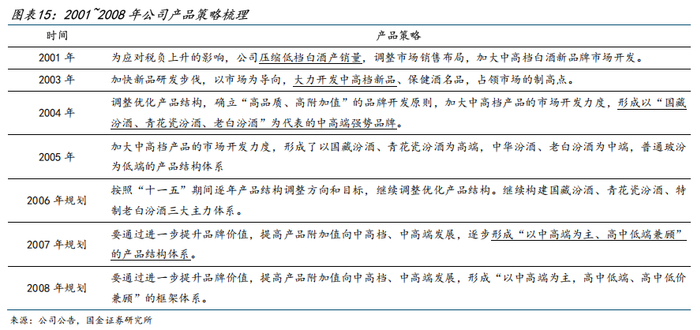 基于上述背景,公司于2001年提出“压缩低档白酒产销量”,产品策略立足点更侧重经营效益、目的是削弱消费税负上升的影响(根据2001年发布的《财政部、国家税务总局关于调整酒类产品消费税政策的通知》,粮食白酒、薯类白酒消费税税率由比例税率调整为定额税率和比例税率,新增0.5元/500g的定额税率),消费税政策调整也进一步夯实了行业高端化趋势。