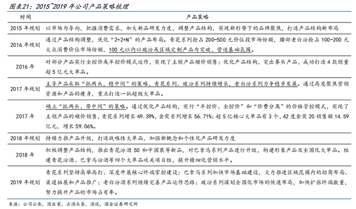 此外,行业内自酱香热后清香品类逐步升温,公司势能释放也推动了清香白酒产区化发展。后文所述的无论是产品策略还是区域策略的演变、优化,均建立在上述体制机制变革的基础之上,是从战术层面公司对如何实现更好更快发展命题的思考与尝试。