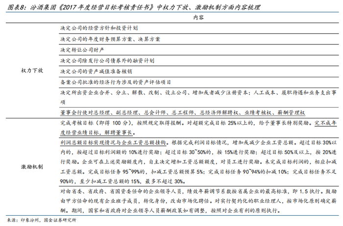 2)在确定考核目标的同时,山西省国资委按照“权责利统一、正向激励”的原则对汾酒集团授权经营,下放经营班子的选聘权、考核权、薪酬管理权等在内八项权利,推进市场化选聘。同时,责任书对实际经营情况明确奖惩,完成情况与企业工资总额直接挂钩。其中重点考核董事长,若完不成年度经营业绩目标将解聘董事长,若超额完成目标25%以上将给予董事长特别奖励。