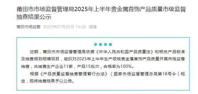 福建省莆田市市场监督管理局发布2025年上半年贵金属首饰产品质量市级监督抽查结果