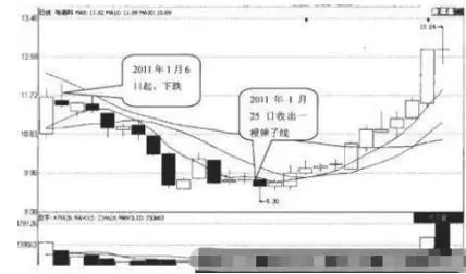 2011年1月25日,该股收出一根很长的锤子线,这表明下档接盘能力较强,后市有转向的可能,投资者应注意现察。之后的两个交易日哈高科接连收出阳线,表明多空双方已经占据了一定的优势,后市走强的可能性很大,投资者可以酌情买入,并把锤子线的下影线末端作为自己的止损点。