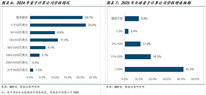 量子计算产业头部效应显著,行业营收有望开启上升通道。在所统计的全球513家量子计算企业中,2024全年收入超过1000万美元的企业数量占比为4.9%,小于50万美元的企业占比42.7%,由于行业尚处于发展前期,两极分化较为明显,头部企业凭借技术积累、资金优势和市场资源,更容易获得高收入并持续扩大领先地位。随着量子硬件部署规模的持续扩大和政府部门资金投入的不断增加,预计2025年约60%的量子计算企业将实现10%以上的营收增长,有望形成技术进步与市场需求相互促进的良性循环。