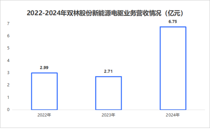 近年来,公司新能源电驱业务迎来了迅猛增长。2022到2024年,双林股份新能源电驱业务营收从2.99亿飙升到6.75亿,实现了翻倍增长。