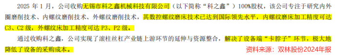2025年1月,双林股份通过收购科之鑫,实现了对核心设备的掌控。科之鑫手握国际领先的数控螺纹磨床技术,内螺纹磨床加工精度达C3、C2级,外螺纹达P3、P2级。