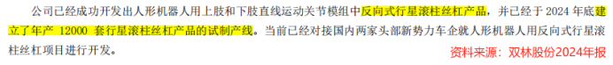 公司于2024年启动研发,短短一年间,其不仅自主研发出反向式行星滚柱丝杠,还建设了年产1.2万套行星滚柱丝杠的试制产线。目前,公司产品已向客户送样,处于客户验证阶段。