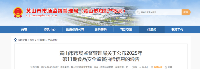 安徽省黄山市市场监督管理局关于公布2025年第11期食品安全监督抽检信息的通告
