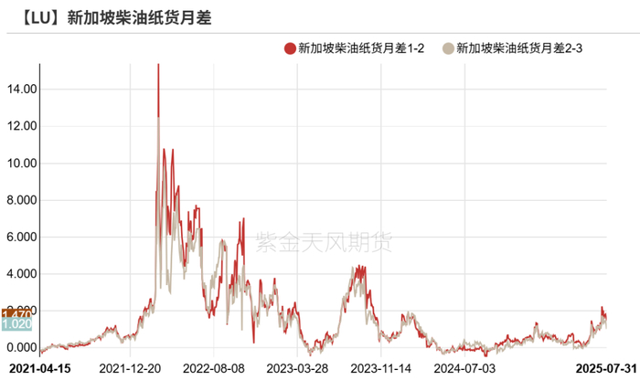 截至2025年7月31日,SIN 380 CST纸货月差为-3美元/吨,ARA HSFO纸货月差为8.5美元/吨