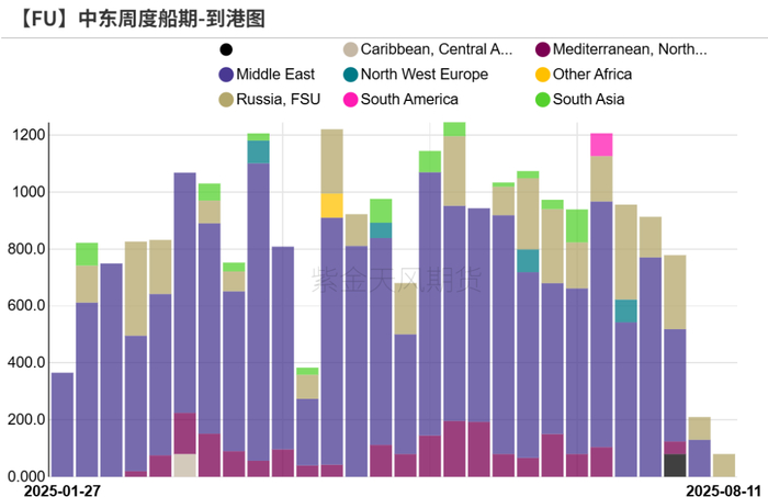 物流端监测:2025年7月中东高硫燃料油出口436万吨,处于历史同期低位。沙特高硫燃料油7月出口显著增加至21万吨。(+34.5%),主要发往新马地区和南亚地区。中东燃料油浮仓小幅下降至96万吨(-1.8)。7月发电需求不高。