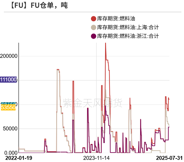截至2025年7月31日,燃料油仓单共111000吨;低硫燃料油仓单共40050吨。(+39960)(上海洋山石油在7月30日增加仓单39960吨)