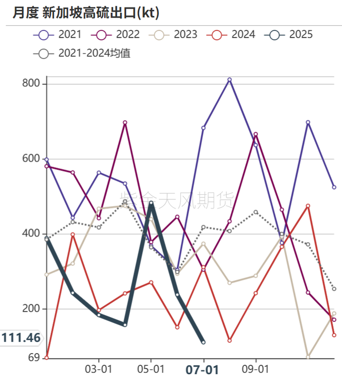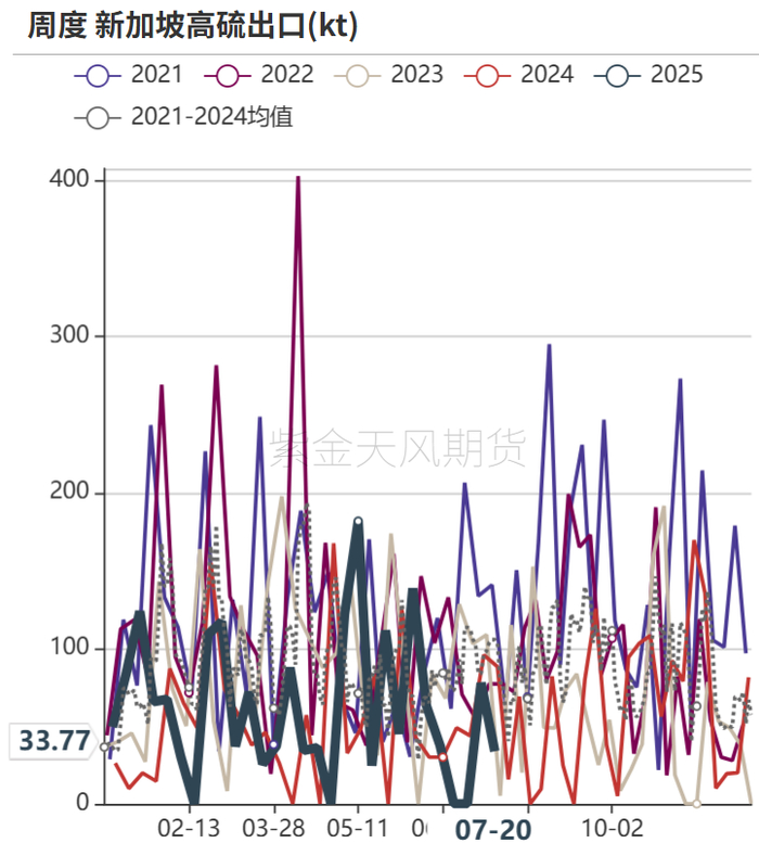 俄罗斯7月出口量环比6月小幅增加:截至2025年7月28日,俄罗斯高硫周度出口43.83万吨,环比上周小幅增加2.7万吨;月度出口236.9万吨,环比6月增加98万吨,同比去年7月减少13万吨,往埃及出口小幅增加。