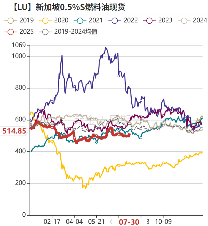 截至2025年7月31日,SIN 0.5%S价格小幅回弹到515美元/吨(+16),贴水4美元/吨(持稳)