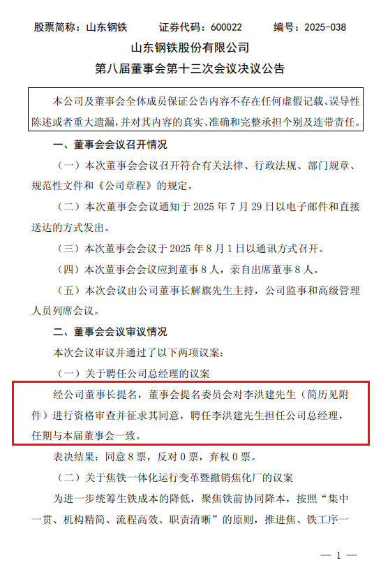 8月1日晚间,山东钢铁发布公告称,公司第八届董事会第十三次会议审议通过了《关于聘任公司总经理的议案》《关于焦铁一体化运行变革暨撤销焦化厂的议案》。经公司董事长提名,董事会提名委员会对李洪建先生进行资格审查并征求其同意,聘任李洪建先生担任公司总经理,任期与本届董事会一致。