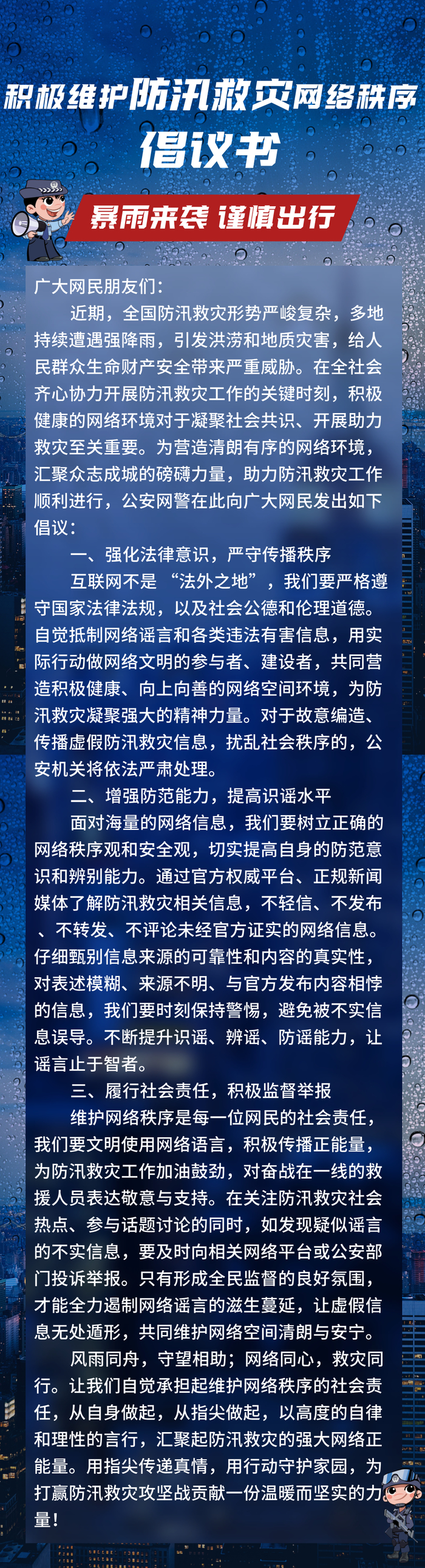 风雨同舟、守望相助!网警发布积极维护防汛救灾网络秩序倡议书