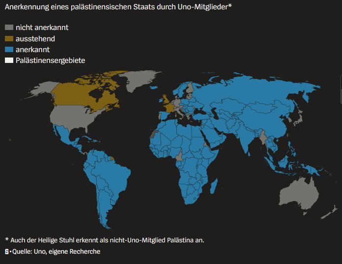 德国在国际层面为以色列“保驾护航”的政策在欧盟内部存在很大的争议,部分成员国(挪威、西班牙、爱尔兰、瑞典等)已相继通过承认巴勒斯坦的决议,保加利亚、塞浦路斯、捷克、匈牙利、波兰、罗马尼亚6国在加入欧盟前已承认巴勒斯坦国,法国也将在今年九月迈出这一步。