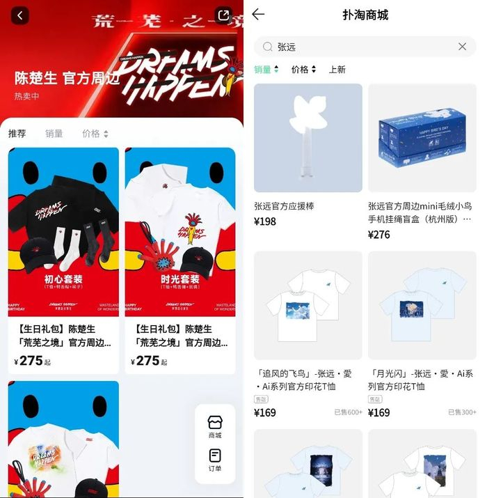 另外一些明星尚未建立自己完整的运营团队,而维护APP、小程序的成本比较高,还是会选择与平台合作。比如,陈楚生的“六毛”就是在大麦商城,张远的“呆呆鸟”是在QQ音乐扑淘商城。
