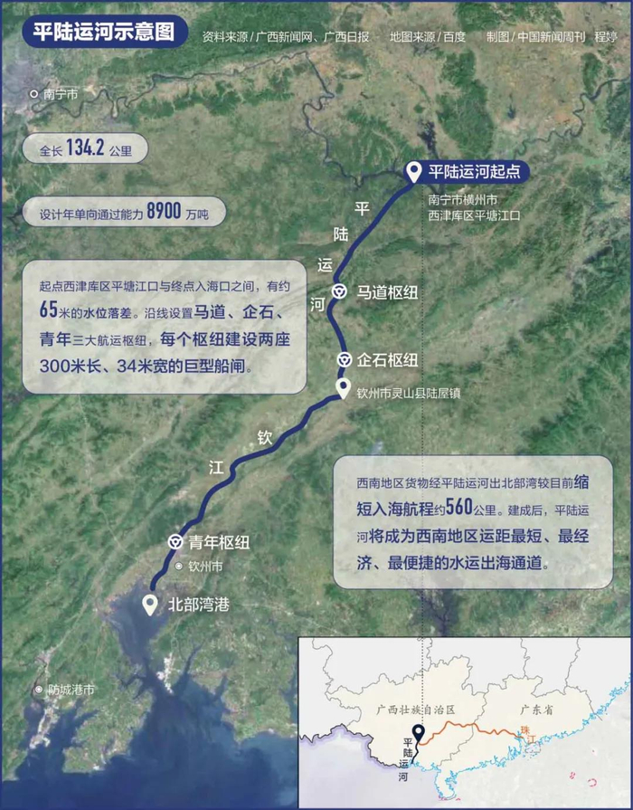 这条全长134.2公里的运河,始于南宁横州市西津库区平塘江口,经钦州灵山县陆屋镇沿钦江进入北部湾,项目总投资约727亿元。建成后,广西乃至西南地区的货物经平陆运河出海,航程可节省约560公里。