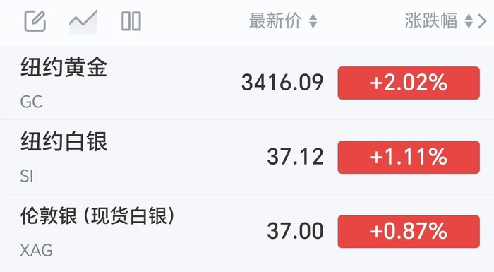 就在昨天,COMEX 黄金期货收涨 2.01% ,报 3416 美元 / 盎司,白银期货也收涨 1.07% ,报 37.105 美元 / 盎司。