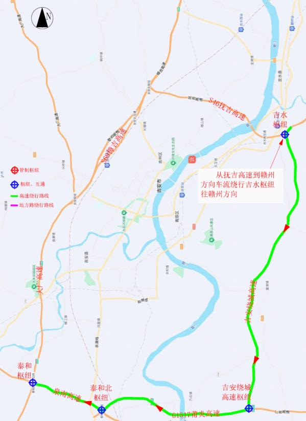 线路一:S46抚吉高速--吉水枢纽--吉安绕城高速--吉安绕城高速枢纽--G1517莆炎高速--泰和北枢纽--泉南高速--泰和枢纽;