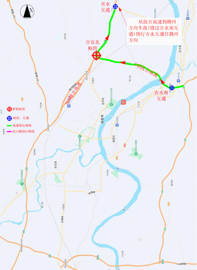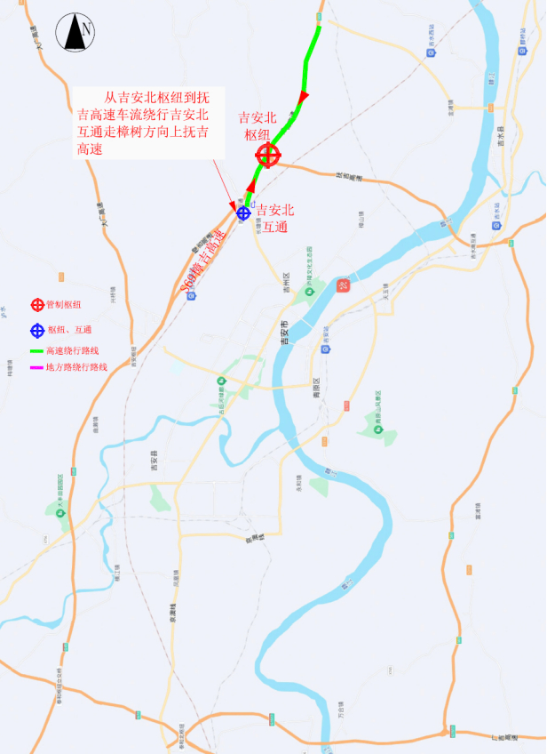线路一:S69樟吉高速--吉安北互通--S69樟吉高速(樟树方向)--吉安北枢纽--S46抚吉高速(抚州方向);