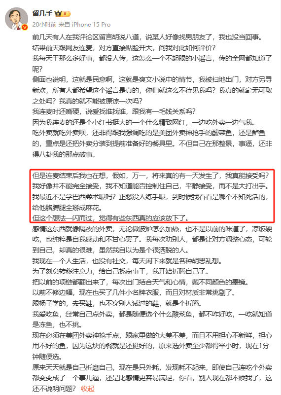 直播结束后,他却在长文中承认内心矛盾:若传闻成真,“不能完全接受”,甚至幻想用所学的巴西柔术“教训新欢”,但最终自我开解“有些东西该放下了。