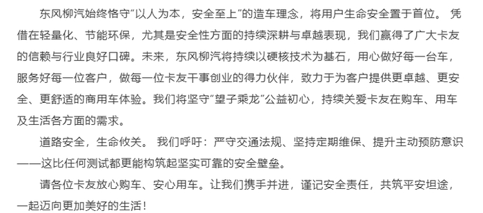 乘龙卡车表示:“道路安全,生命攸关。我们呼吁:严守交通法规、坚持定期维保、提升主动预防意识——这比任何测试都更能构筑起坚实可靠的安全壁垒。请各位卡友放心购车、安心用车。”