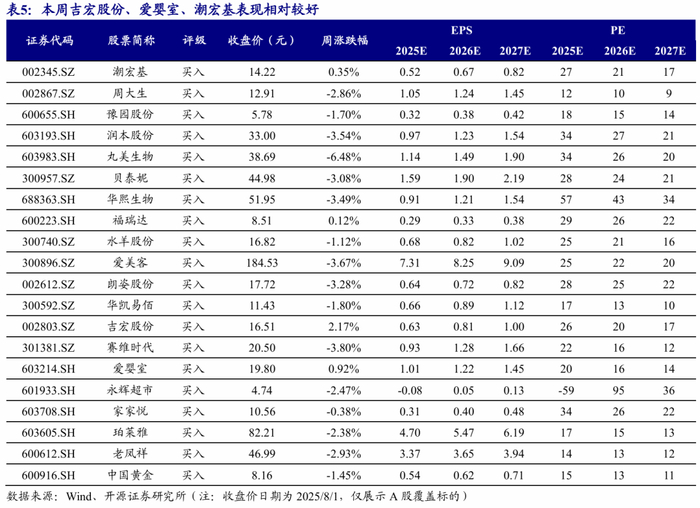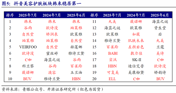 7月抖音美容护肤板块韩束稳居第一,国货护肤品牌整体表现突出。据青眼数据,国货品牌在该板块TOP20中占据15席,其中TOP10占比达到8席,较6月的11席进一步提升。具体来看,韩束稳居榜首,C咖由2024年的第20名跃升至第7名,百雀羚则从2024年未上榜重回第15位,并在年内多次进入榜单,国产化趋势持续加强。我们认为,国货品牌凭借产品力不断释放优势,叠加平台流量效应持续积聚,有望在未来进一步扩大市场份额。
