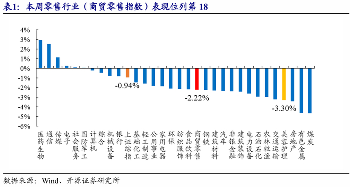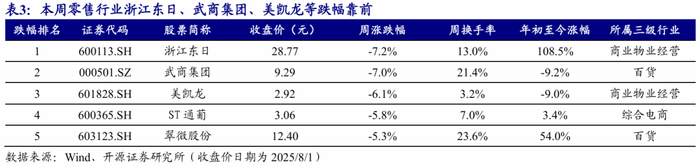 本周(7月28日-8月1日)A股下跌,零售行业指数下跌2.22%。上证综指报收3559.95点,周累计下跌0.94%;深证成指报收10991.32点,周下跌1.58%;本周全部31个一级行业中,表现排名前三位的分别为医药生物、通信和传媒。零售行业指数(参照商贸零售指数)本周报收2213.32点,周跌幅为2.22%,在所有一级行业中位列第18位。2025年年初至今,零售行业指数下跌1.14%,表现弱于大盘(2025年年初至今上证综指累计上涨6.21%)。