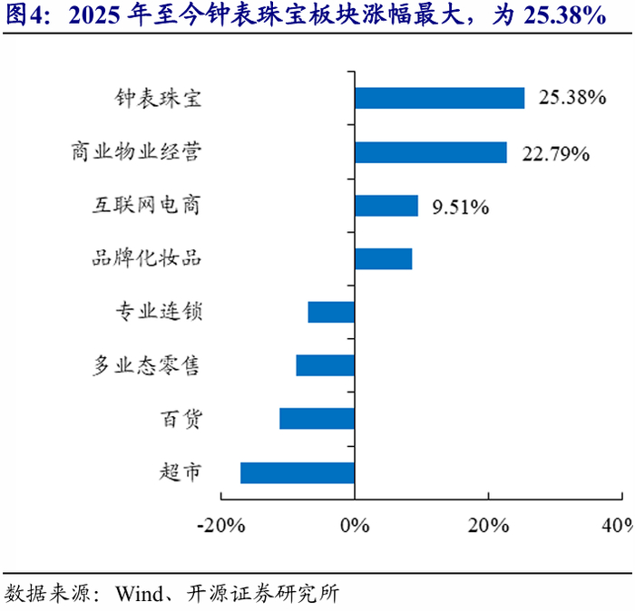 零售各细分板块中,专业连锁板块本周涨幅最大;2025年年初至今,钟表珠宝板块涨幅最大。在零售行业各主要细分板块(我们依据二级行业分类,选择较有代表性的超市、百货、多业态零售、专业连锁、商业物业经营、互联网电商、钟表珠宝和品牌化妆品8个细分板块)中,本周1个子板块上涨,其中专业连锁板块涨幅最大,周涨幅为0.04%;2025年全年来看,钟表珠宝板块年初至今累计涨幅为25.38%,在零售行业各细分板块中领跑。