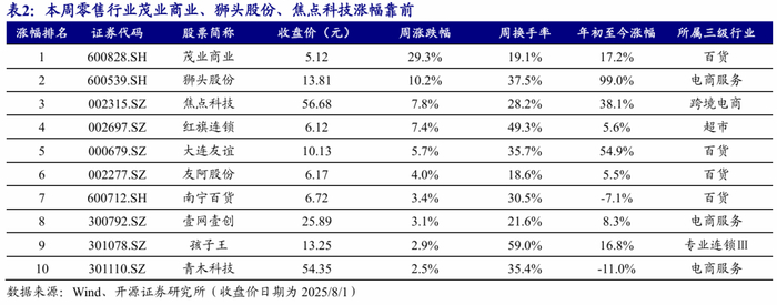 本周(7月28日-8月1日),商贸零售指数报收2213.32点,下跌2.22%,跑输上证综指(本周下跌0.94%)1.28个百分点,板块表现在31个一级行业中位居第18位。零售各细分板块中,本周专业连锁板块涨幅最大,2025年年初至今钟表珠宝板块领跑。个股方面,本周茂业商业(+29.3%)、狮头股份(+10.2%)、焦点科技(+7.8%)涨幅靠前。