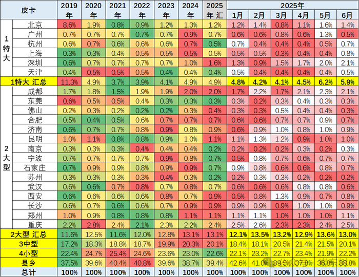 皮卡市场主力销售区域还是在以中小城市和县乡市场为主,但随着电动化皮卡和乘用化皮卡的推出,大城市需求得到改善。2025年6月深圳等限购市场表现较好。而县乡市场近期大幅走强,燃油皮卡的大城市市场目前来看并没有明显的突破特征。6月的县乡市场表现相对3月回落较大。