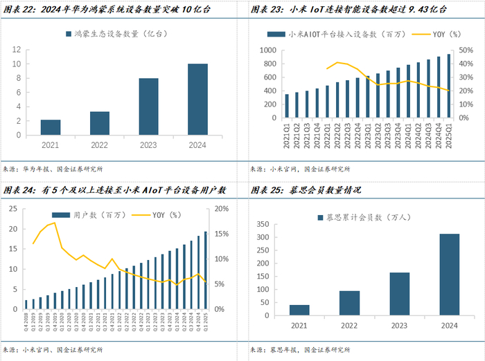 品牌力传播层面。大厂生态链拥有丰厚的用户资产,其品牌影响力覆盖了不同年龄、不同消费层次的消费者。例如,2024年鸿蒙生态/小米AloT平台接入设备数分别为10亿/9亿台。传统床垫生产企业用户资产相对薄弱,以慕思为例,2024年会员数为314万人。通过与大厂的合作,传统厂商借力大厂“用户资产”即可穿透原有限定客群,实现人群资产的指数级扩容。