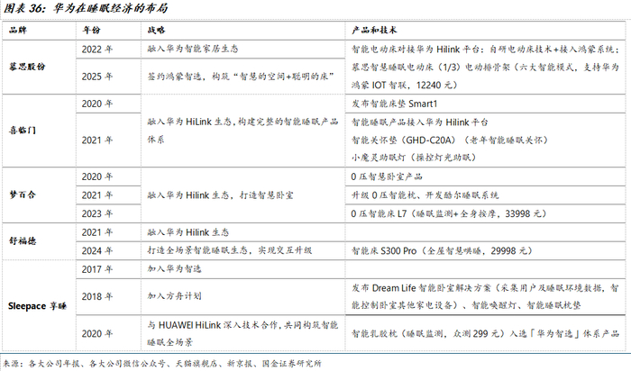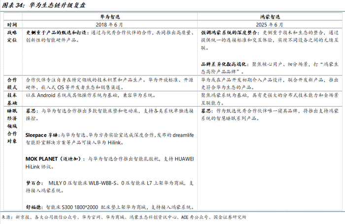 华为生态链在智能睡眠的布局:智选阶段侧重选择优质睡眠领域品牌,鸿蒙智选侧重系统性布局。华为智选帮助其产品接入HUAWEI HiLink或鸿蒙全屋智能系统,从而支持用户通过华为智慧生活App等方式实现集中控制,例如与享睡、梦百合等品牌的合作。在焕新为“鸿蒙智选”后,华为明确提出构建智能健康睡眠生态系统的系统性布局,致力于与合作伙伴共同将睡眠产品升级为智慧睡眠生活,2025年已和慕思签署鸿蒙智选合作备忘录。