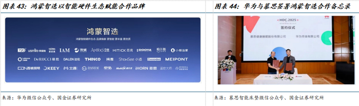 华为鸿蒙智选:展望未来,华为鸿蒙智选及其联合开发产品的生态模式值得关注。2025年6月,华为正式签署鸿蒙智选合作备忘录,并宣布“华为智选”品牌焕新为“鸿蒙智选”,标志着其业务版图将全面覆盖智能家居等多细分领域。慕思股份通过AI+床垫引领健康睡眠新风尚,构建无缝协同的全场景睡眠生态。