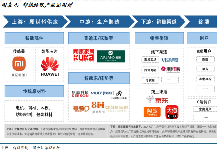 如何打造睡眠生态:酒店场景化体验与智能家居生态链的双模式探索。为解决睡眠设备孤立性问题,睡眠经济产业链需从上游原材料供应、中游生产制造,到下游渠道销售及终端消费者体验的全链条入手,打造完整的睡眠生态系统。