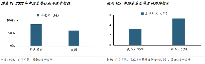 渗透率及产品更新率仍有提升空间。据CSIL统计数据,中国床垫渗透率仅为60%,且50%的中国家庭的床垫使用年限超过5年。伴随中国消费者健康睡眠及换新意识的逐步提升、换新意识提升和产品力迭代,将催化床垫行业渗透率和产品更换率的提升。