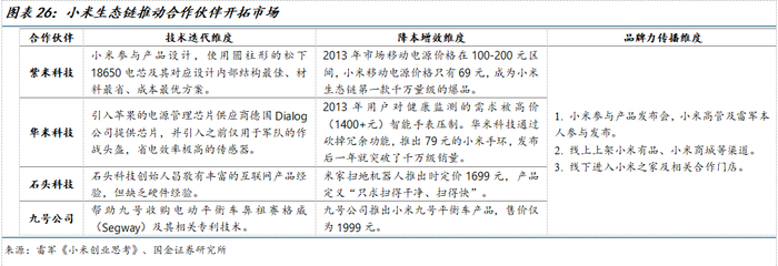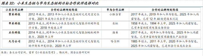 合作模式差异:华为强强联合求同存异,小米“竹林理论”孵化初创。华为生态链的合作伙伴通常为深耕行业多年的上市公司与行业头部玩家,华为主要提供标准、开源硬件、嵌入式OS等综合解决方案,合作伙伴在产品研发、自身品牌、渠道力量保留较大空间。小米生态链通过“投资+小米模式”孵化有技术潜力的初创硬件公司,合作过程中小米介入产品开发早期阶段,主导产品定义、工业设计、定价与质量监督,同时为生态链企业提供供应链协同、技术支持以及渠道共享等核心资源。