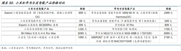 产品定位差异:华为瞄准中高端市场,小米性价比覆盖大众市场。华为聚焦高端全屋智能市场,小米通过高性价比占据消费级市场主导地位,更适合追求实用和多样化选择的用户,例如,华为全屋智能控制中枢产品,智能中控屏 MINI Wi-Fi 版定价2499元,而小米Xiaomi智能家庭屏最新款10定价仅899元。