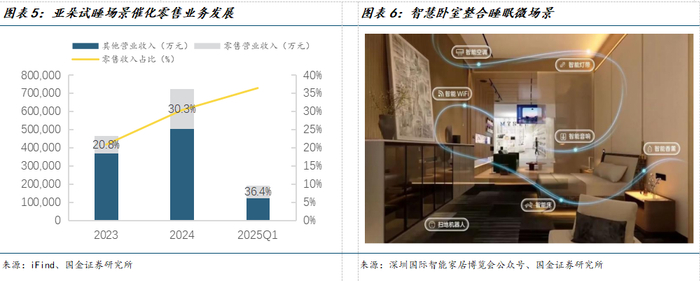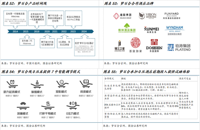梦百合自2014年布局智能床垫赛道。产品层面,梦百合凭借0压棉材料和高灵敏度感应传感器,提升睡眠舒适性并实时监控睡眠指标生成健康数据报告。2021年梦百合接入华为全屋智能生态,拓展智能家居场景。渠道方面,梦百合自2012年起率先推出酒店0压合作模式,与锦江酒店、首旅如家等3000多家酒店合作,通过铺设0压床品实现房型溢价收益共享,拓展智能床垫体验场景。2024年,梦百合投资“梦百合0压酒店”,打造“体验即可购”的新零售酒店空间,实现智能家居场景化消费触达。
