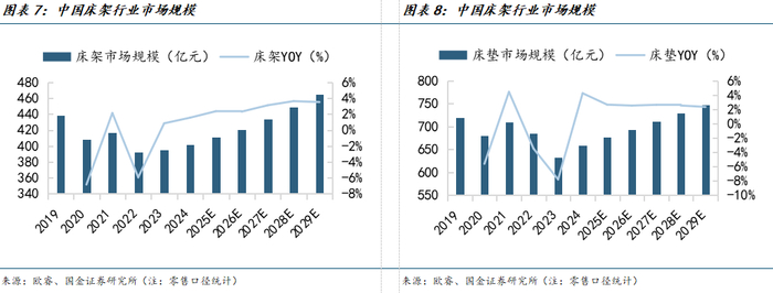 床垫市场:2024年中国床垫市场规模为659.0亿元,2019-2024年CAGR为-1.8%。中长期来看,伴随消费信心回暖与居民睡眠需求的智能化、多元化升级,行业有望回归平稳通道,根据欧睿预测,2029年中国床垫市场规模将达到747.1亿元。