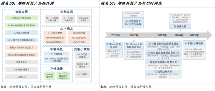 产品矩阵丰富,覆盖多睡眠场景。趣睡科技基于对中国年轻中产消费需求的理解,将高科技材质应用、环保材质应用与智能互联网应用相互连接。2019年趣睡从电动床发力,推出8H Milan智能电动窗,开启智能家居新时代。此后公司不断迭代智能床产品,并将产品矩阵扩张至智能恒温水暖毯、智能床头柜等智能家居生态链,相关产品销量屡创新高。展望未来,公司持续深耕睡眠赛道研发突入,8H高端定制床垫、智能监控助眠床垫、米家AI智能深睡枕头正在开发阶段,有望打造更加丰富的智能家居睡眠产品线。
