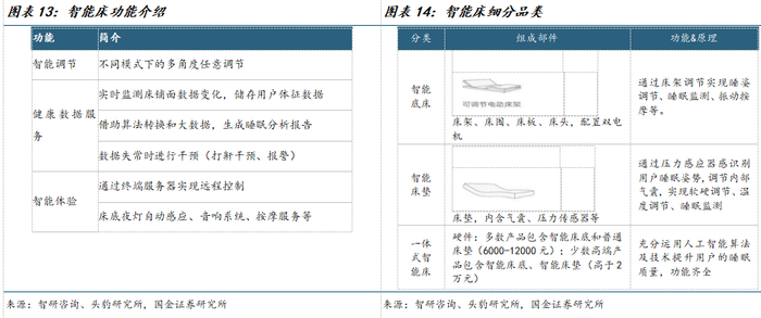 传统床具及床垫市场进入成熟稳态,但伴随消费者对睡眠品质升级诉求的边际强化,智能床及智能床垫正凭借功能迭代与场景渗透加速打开增量空间,赛道扩容势能持续释放。智能床是通过智能调节、健康数据服务和智能体验功能,为用户提供全面且个性化睡眠解决方案的创新产品。根据功能设计,智能床主要分为智能底床、智能床垫和一体式智能床三种类型。其中,智能底床通过电动排骨架实现调节功能;智能床垫则依靠床垫内的气囊进行调节;而一体式智能床则是将智能底床和床垫组合起来,通过协同调节实现更优的睡眠体验。