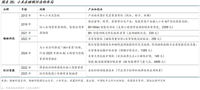 小米生态链在智能睡眠领域的拓展与赋能。小米通过生态链企业的协同布局,深度切入睡眠经济赛道。2015年,趣睡科技加入小米生态链,凭借其在睡眠产品研发方面的专长,先后推出米家品牌、8h品牌等多款床垫及智能睡眠产品,并于2019年通过米家APP构建全屋智能场景化的睡眠解决方案。2025年,织识智能加入小米生态链,其柔性织物压力传感器技术被应用于智能床垫,进一步丰富了小米在智能睡眠领域的产品矩阵。