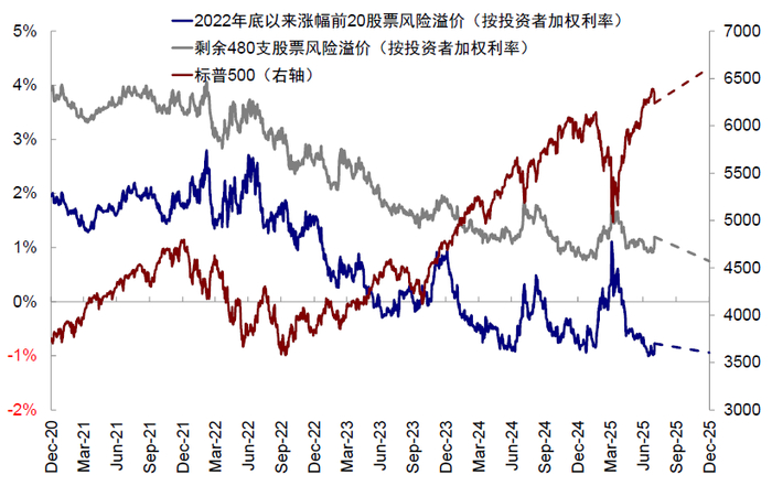 图表:对等关税后,2022年底以来涨幅前20股票风险溢价相对标普500持续下行,而剩余480支上行