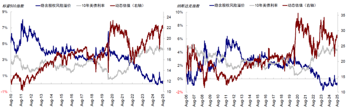 图表:2022年后美股风险溢价持续回落甚至跌成负值,尤其是纳斯达克