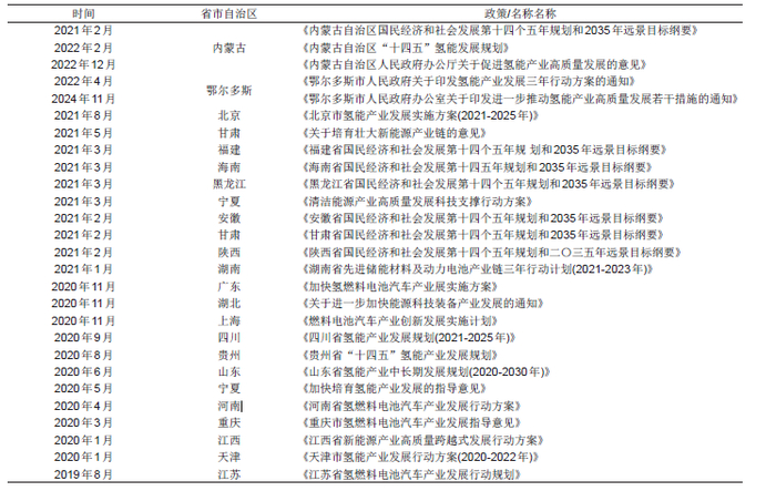表2各地氢能政策汇总(部分)